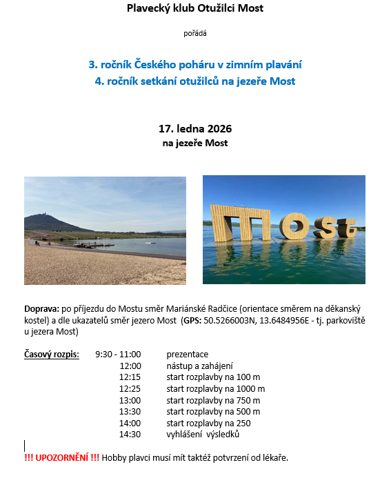 Srdečně zveme všechny milovníky studené vody 17.1.2026 na jezero Most, kde pořádáme 3. ročník ČP v zimním plavání a pro hobby plavce 4. setkání otužilců. Více informací naleznete v propozicích - viz. odkaz níže.